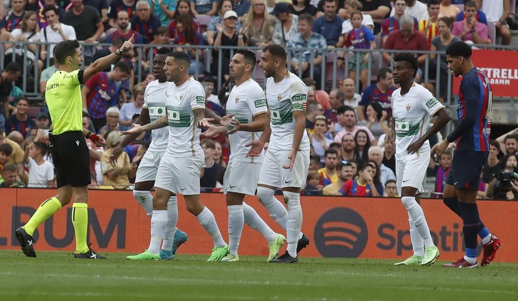 El Elche trabó el partido y a los azulgrana les faltaba fluidez. Con De Jong y Pedri en la manija, los cinco cambios introducidos por Xavi respecto al partido en Múnich no tenían claridad por la densidad defensiva de los ilicitanos y la falta de velocidad en la circulación de los locales. Solo Ousmane Dembélé, que la pasada madrugada fue padre, aparecía por la derecha para darle profundidad a su equipo. El partido se rompió en una acción de Frenkie, que habilitó a Lewandowski. Gonzalo Verdú agarró al polaco y fue expulsado.