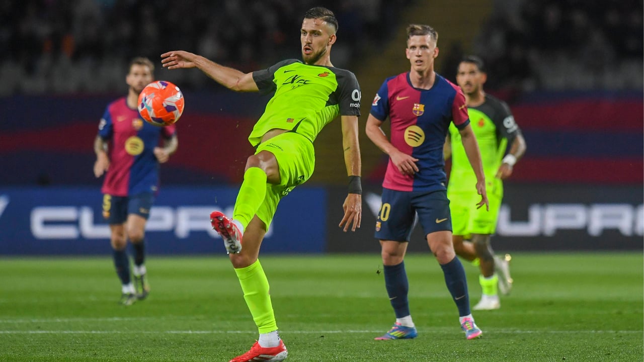 En el tramo final de la primera parte, el partido se convirtió en un auténtico asedio por parte del Barça, que no lo dejaba de intentar. Un palo de Gavi fue la ocasión más clara, pero no fue la única, ya que los blaugranas buscaban dejar claro que querían adelantarse cuanto antes en el marcador. De forma constante, el acoso culé hacia los bermellones persistía, aunque Leo Román se erigió en el defensor, a la numantina, de un club que estaba muy agobiado.