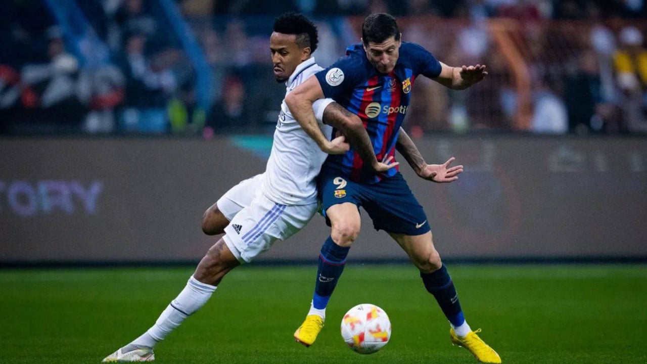 Lewandoswki y Militao peleando por un balón en la final de la Supercopa de España 2023.Cordon Press.