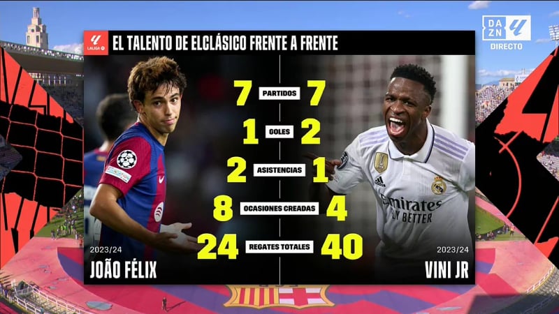 La emisión de DAZN nos ofrece esta interesante comparativa entre Joao Félix y Vinícius Junior, dos de los jugadores llamados a desequilibrar el Clásico que disputan en media hora FC Barcelona y Real Madrid.
