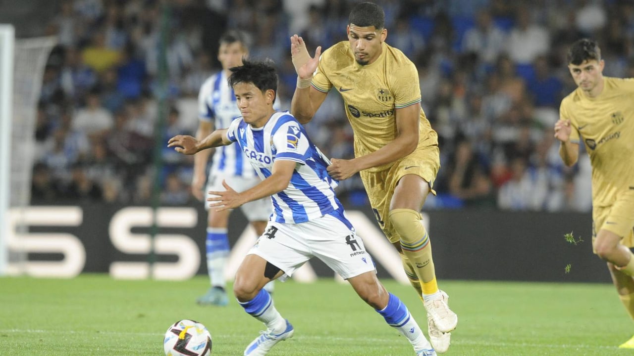 Araújo trata de frenar a Kubo en el partido disputado en la primera vuelta entre Real Sociedad y Barcelona.UES