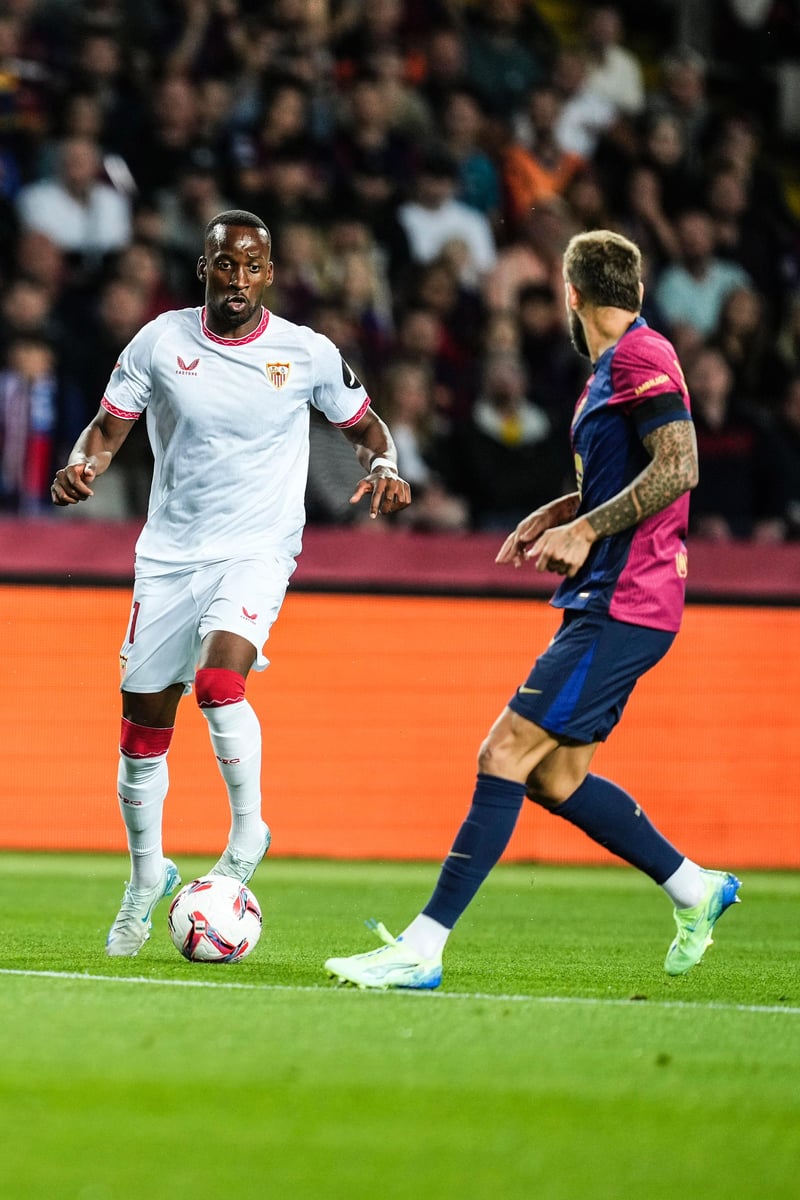 Aunque García Pimienta apuntaba en los prolegómenos que la clave podía pasar por quitar el balón al Barcelona, dando por hecho que ambos equipos sufren sin posesión, los nervionenses parecen renunciar de salida a la iniciativa, esperando con las líneas muy juntas para robar y salir rápido al contragolpe. Lo intentó y casi lo consigue Lukébakio, mientras que otra transición dirigida por Peque concluyó con un último pase defectuoso. Buena presión blanquirroja.