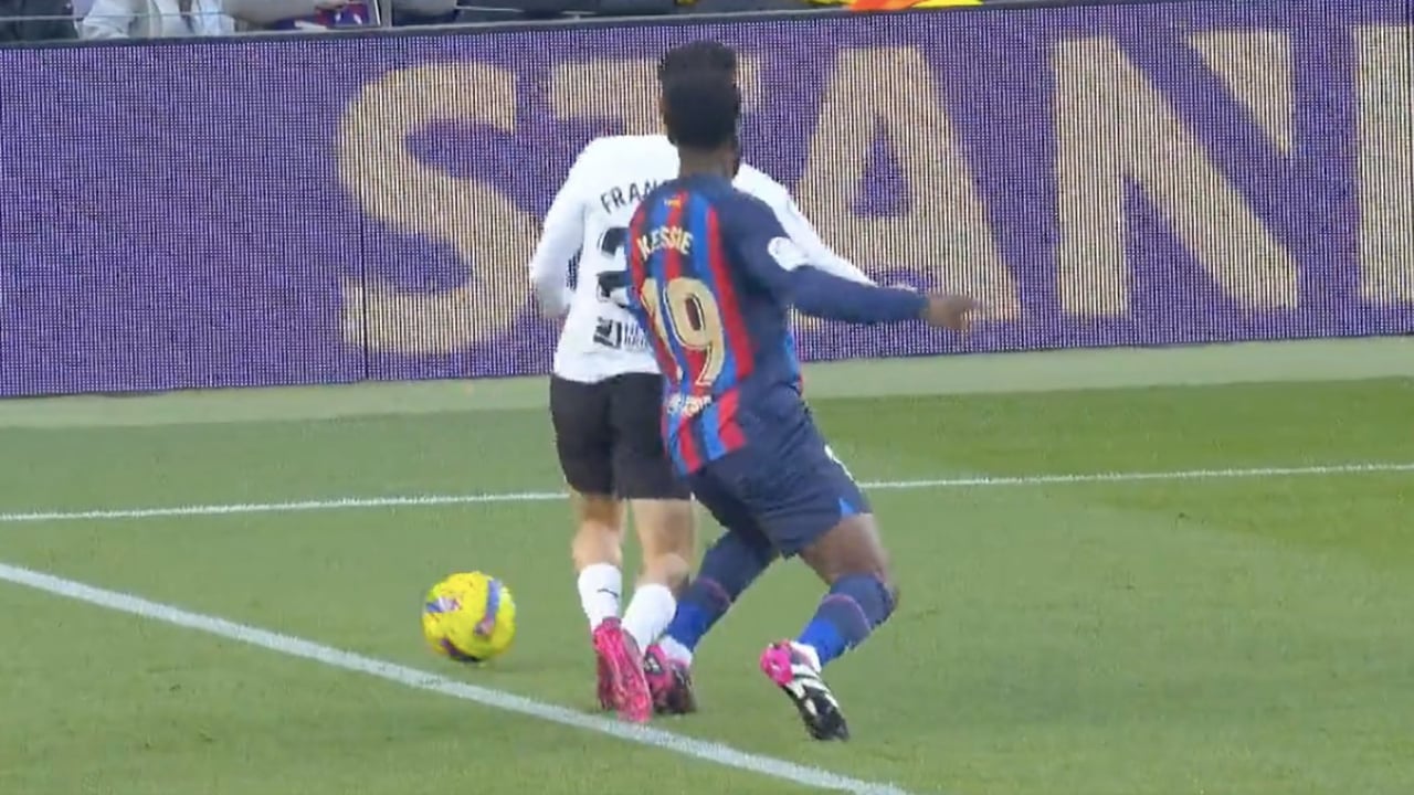El joven jugador del Valencia entraba por la banda izquierda en el área de penalti cuando el medio del Barça parecía trabarle por atrás para hacerle caer al suelo en su intento por tocar el balón. He aquí la acción.