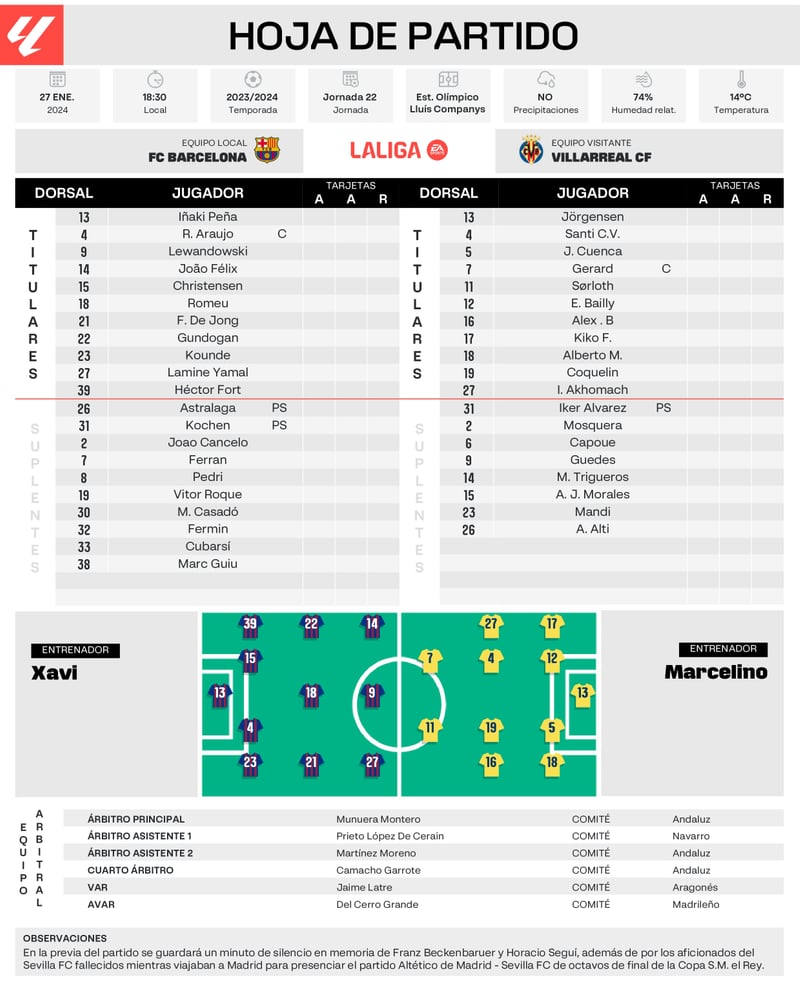 Iñaki Peña, Kounde, Araujo, Christensen, Héctor Fort; Oriol Romeu, De Jong, Gündogan; Lamine Yamal, Joao Félix y Lewandowski.