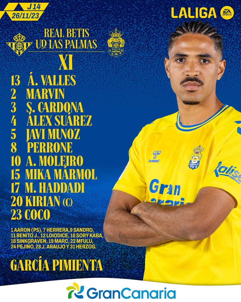 Las Palmas: Álvaro Valles; Álex Suárez, Coco, Mika Marmol, Cardona; Marvin, Javi Muñoz, Perrone, Kirian, Moleiro; y Munir.