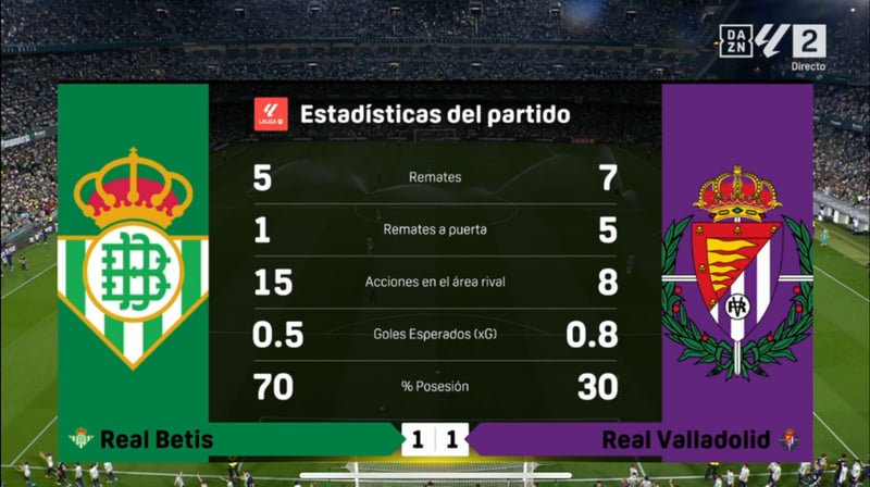 Había más licencias defensivas de lo deseable en el Real Betis, fruto a veces de la imprecisión entre líneas de sus futbolistas o de alguna pasividad sobrevenida, aunque los de Manuel Pellegrini confiaban ciegamente en su pegada a la hora del intercambio de golpes. Lo intentó desde lejos otra vez Chuki, sin problemas para Adrián, al tiempo que Antony la mandaba a las nubes en una de sus clásicas incursiones en diagonal justo antes de un pique con Aznou por dejarle el codo. Tampoco hubo remate en una llegada de Jesús Rodríguez hasta la línea de fondo, pero tanto fue el cántaro a la fuente que se acabó rompiendo: gran pase de Raúl Moro a la espalda de los centrales para que el vigilado Iván San José aprovechase la media salida del portero local para regatearle y anotar el 1-1 a puerta vacía a cuatro del intermedio. A remar, también contra la euforia no bienvenida, pues el Valladolid exhibía orgullo pese a su delicada situación clasificatoria, avisando luego con el asistente, Jesús Pérez y Anuar Tuhami.