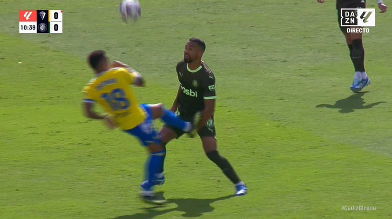 La falta botada por el Cádiz acaba en balón para el Girona tras el choque de cabezas entre Yangel Herrera y Rubén Alcaraz. Choque de trenes por los aires... Por suerte ambos pueden continuar sin más problemas...