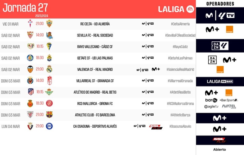El azar o, simplemente, la desatención a fiestas locales, que podrían suponer en algunos casos un problema serio de seguridad o de aglomeraciones, acontece de nuevo al conocerse los horarios de la jornada 27ª de LaLiga, con la que se inaugura el mes próximo, y que contiene choques clásicos de Primera división, como el Sevilla FC-Real Sociedad (sábado 2-M, 14:00 horas), el Atlético de Madrid-Real Betis (domingo 3-M, 16:15 h) o el Athletic Club-FC Barcelona (domingo 3-M, 21:00 h), aunque también un Valencia CF-Real Madrid que cerrará la entrega sabatina a las nueve de la noche del primer sábado de marzo. Precisamente, el segundo día de mascletás en la capital del Turia, que celebra sus Fallas realmente durante todo el mes, pues concluye siempre en torno a San José (19-M). Un fin de semana en el que la fiesta arranca oficialmente y en el que será bastante complicado moverse por la ciudad.
