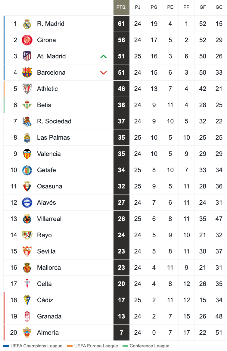 El club barcelonés se sitúa cuarto, empatado con el Atleti, que acaba de ganar. Si además le sumas que el Madrid va primero y su vecino Girona segundo, en la parroquia culé está quedando una temporada para el olvido, solo solucionable por una Champions.