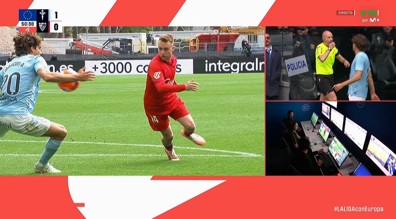 Pide penalti el Celta sobre Mingueza por agarrón, pero el árbitro no pita nada. Lo cierto es que Juanlu va agarrando al rival, pero el colegiado interpreta que no es suficiente