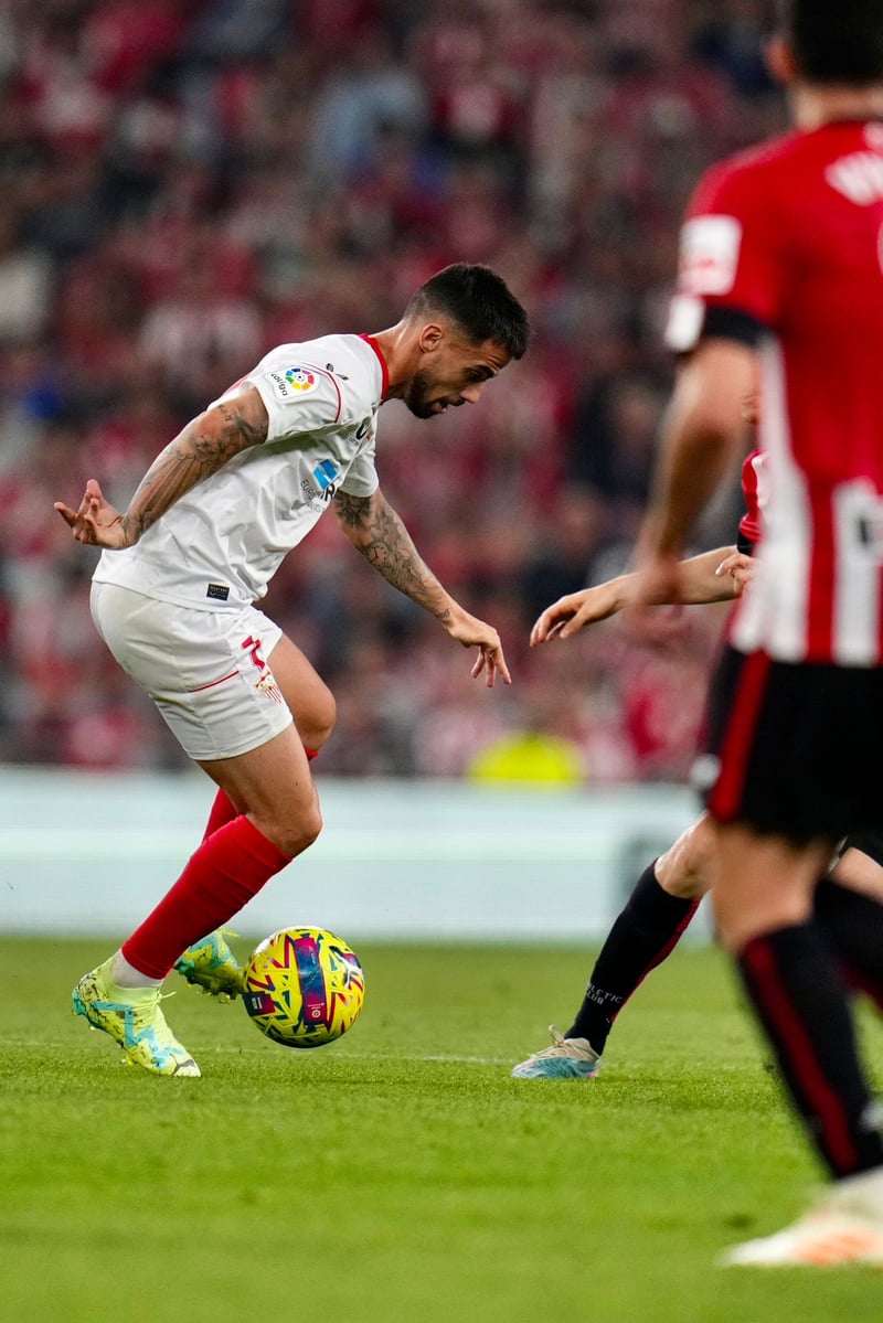 Para su séptimo partido al frente del Sevilla FC -con 13 puntos de 15 posibles en LaLiga y un sonado pase a 'semis' de Europa League eliminando al Manchester United-, Mendilibar sorprendió dejando en el banquillo a Pape Gueye y con siete cambios con respecto al duelo ante el Villarreal. Sólo repitieron Dmitrovic, Badé, Rakitic y Suso, con regresos de Navas, Gudelj, Ocampos, Lamela y En-Nesyri además del ya mencionado de Acuña en un 1-4-2-3-1 que se impone como dibujo predominante en la pizarra de Mendilibar, que sigue viendo al gaditano como el que mejor interpreta ese puesto de mediapunta que el fútbol moderno quiere convertir en especie en extinción.