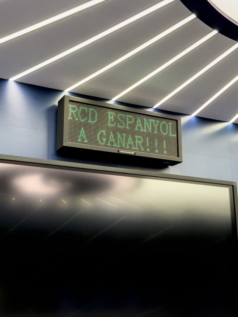 "RCD Espanyol a ganar" puede leerse en una de las pantallas del estadio.