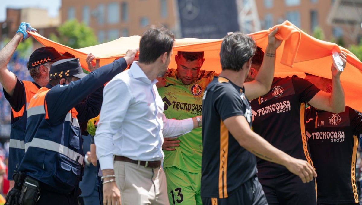 En una jugada apenas sin peligro, David Soria salía para despejar el balón ante la carrera de Larin con un defensa azulón pero el canadiense llegaba con más fuerza y arrollaba a Soria sin verlo en su lucha con el central saliendo el meta muy malparado. Rápidamente entraron las asistencias e incluso la ambulancia, temiéndose algo pero tras casi diez minutos de juego parado, el meta podía reincorporarse y salir andando por su propio pie aunque con ayuda.