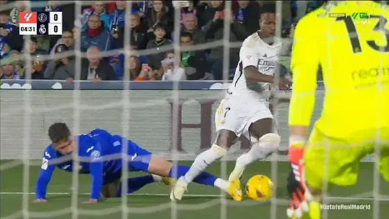 ¡Atrapa David Soria! Gran pase en largo de Nacho que controla Vinicius, ganándole la espalda a la defensa azulona, pero su disparo raso con la zurda lo detiene el meta local.