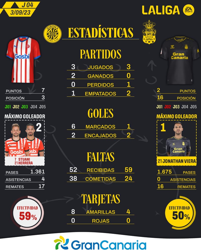 Así llegan Girona y Las Palmas al partido de la jornada 4 de LaLiga