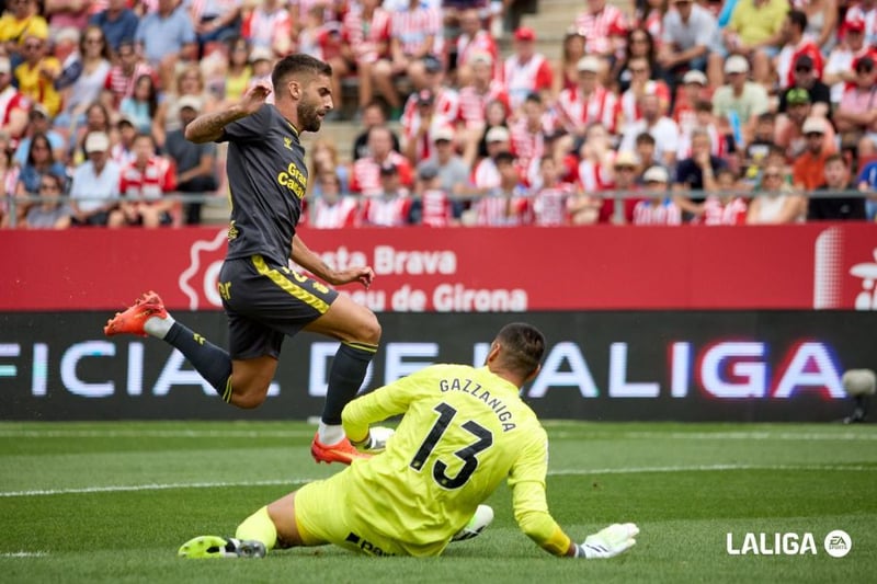 Gran pase de Stuani para ceder una bola de frente a Tsygankov. El ucraniano mandó el balón arriba. Achucha el Girona.
