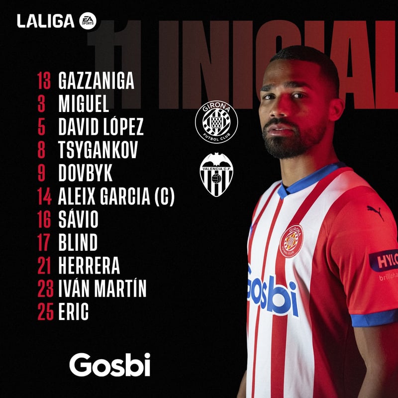 Once del Girona: Gazzaniga; Èric, David López, Blind, Miguel; Herrera, Aleix García; Tsygankov, Iván Martín, Sávio; Dovbyk.