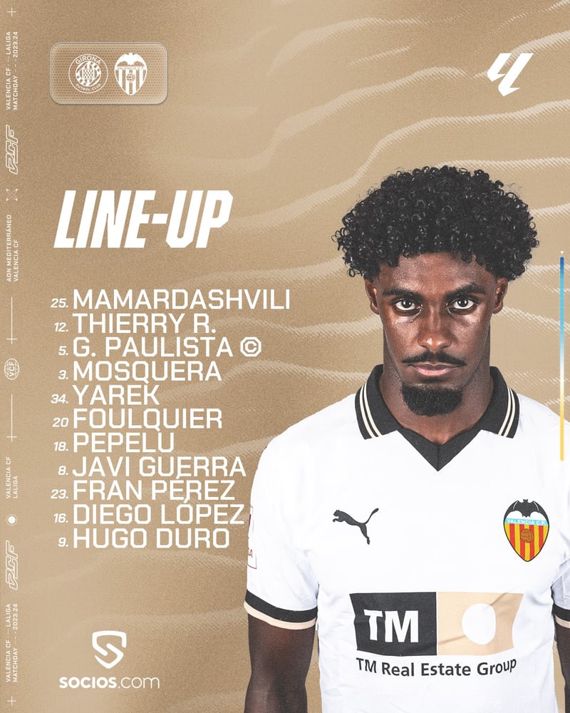 En el once catalán, David López recupera el puesto en el once, en detrimento de Aranu Martínez. Èric García se mueve al lateral derecho. Dovbyk ha superado la lesión y regresa al once para sentar a Stuani. Por otro lado, en el Valencia Yarek suple la ausencia del lesionado Gayá, mientras que Foulquier es el elegico de Baraja para tapar a Sávio Moreira.
