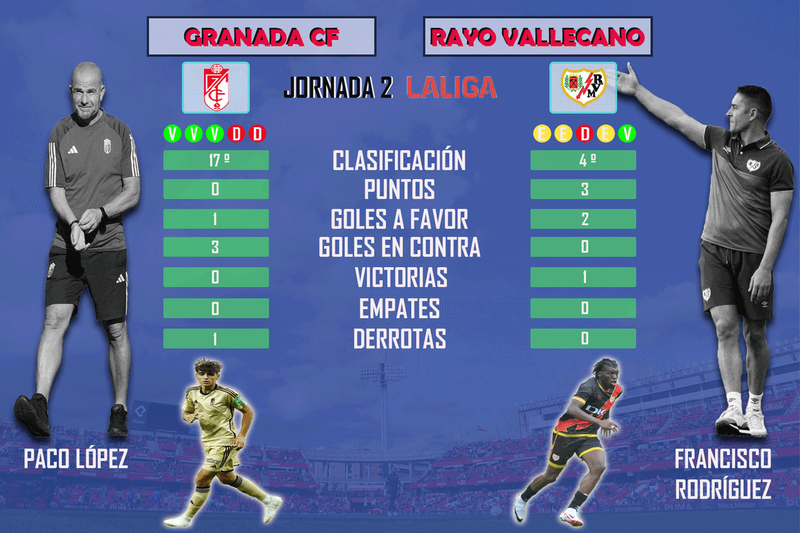 Granada CF y Rayo Vallecano se ven las caras en el Estadio de los Cármenes en la jornada 2 de LaLiga EA Sports. El conjunto de Paco López debuta ante su público con la intención de borrar de la mente la derrota de la semana pasada en el Metropolitano ante el Atlético de Madrid. Por su parte, el combinado madrileño llega a la cita después de haber ganado en el estreno por 0-2 frente a la UD Almería. Un duelo de equipos llamados a compartir mismas aspiraciones en la tabla clasificatoria. El encuentro arranca a partir de las 21:30 horas y estará dirigido por el árbitro Pablo González Fuertes, del comité canario.