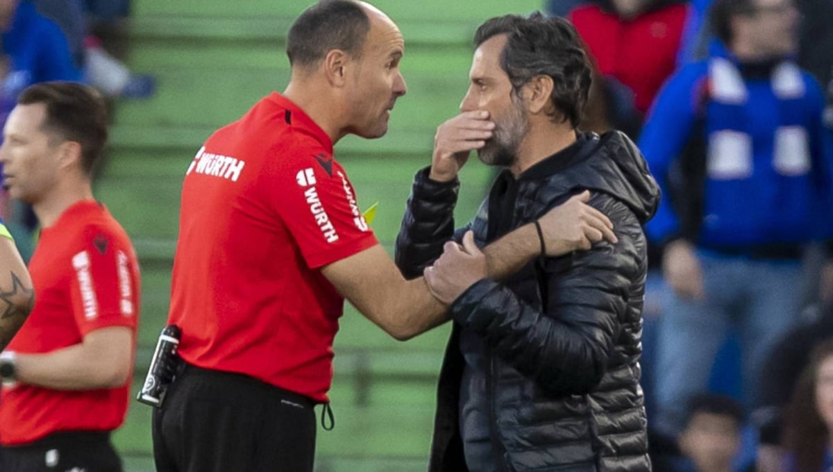Mateu Lahoz dialoga con Quique Sánchez Flores cuando dirigía al Getafe la pasada campaña.UES