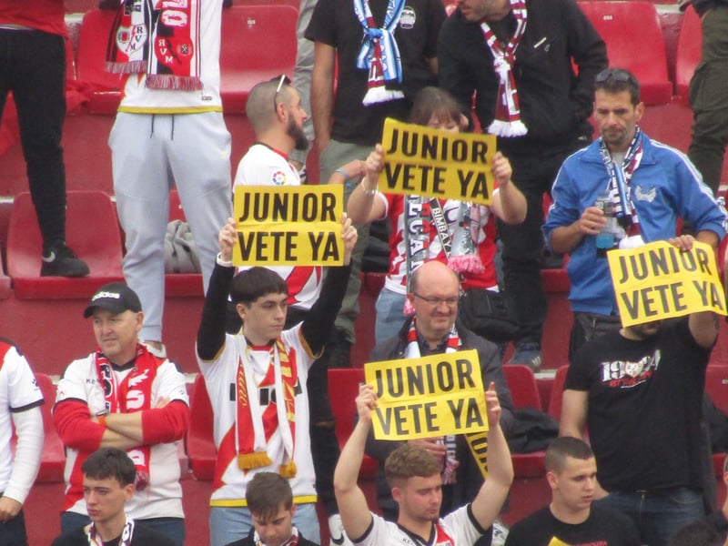 Como símbolo de que la escena escapó de la espontaneidad, los más de 100 aficionados rayistas presentes en la grada visitante colocada en lo más alto de la Grada de Gol Sur, esquina con el graderío de Fondo, mostraron las famosas pancartas amarillas con las grafías negras de "Junior, vete ya", que más de 2.000 aficionados sevillistas mostraron en la previa al partido al Getafe. Al margen de lo que sucediera en el césped, donde la rivalidad campó a sus anchas entre dos equipos que afrontaron la jornada con tan solo un punto de distancia, la tensión se palpó en el ambiente durante varios momentos del duelo.