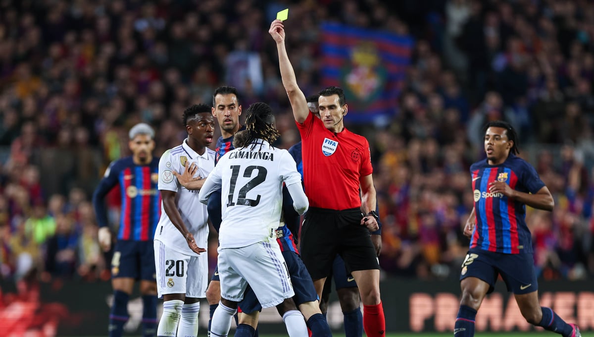 Martínez Munuera muestra amarilla a Camavinga en la semifinal de Copa del Rey en el Camp Nou, en abril del 2023.CORDON PRESS