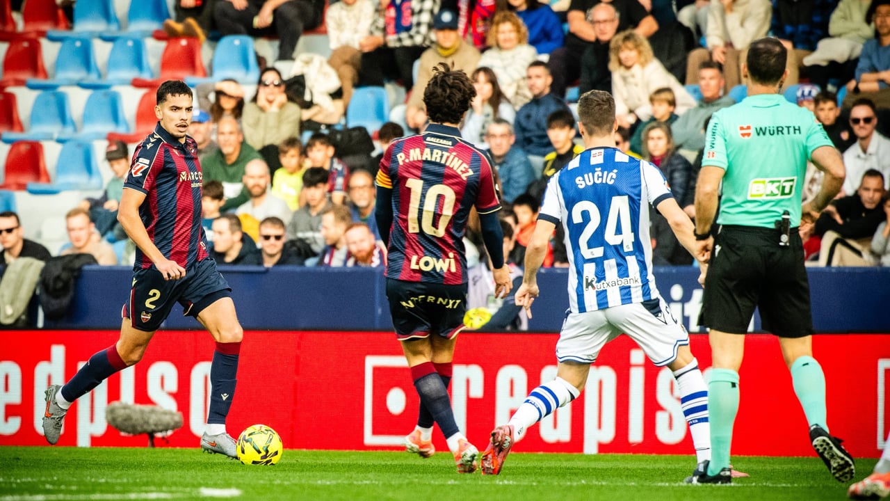 Empate con muy diferente sabor de boca entre Levante y Real Sociedad que sirve de poco a ambos equipos. El gol de Kubo en una igualada primera mitad parecía ser suficiente para que los donostiarras volviesen a la senda de la victoria, pero los de Ansotegi no sentenciaron y recibieron el mazazo del empate en el último suspiro, merced a un penalti cometido por Mariezkurrena que transformó Dela.