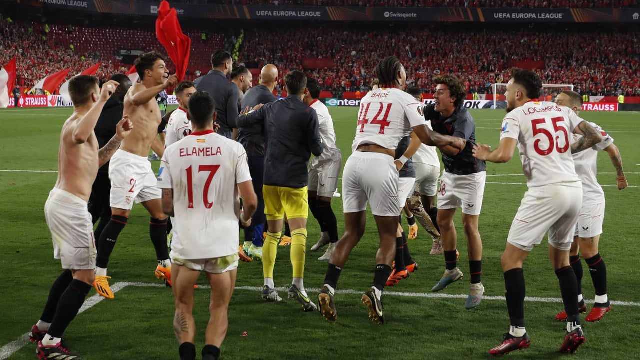 Los jugadores del Sevilla, celebrando su clasificación para la final de la Europa League.UES