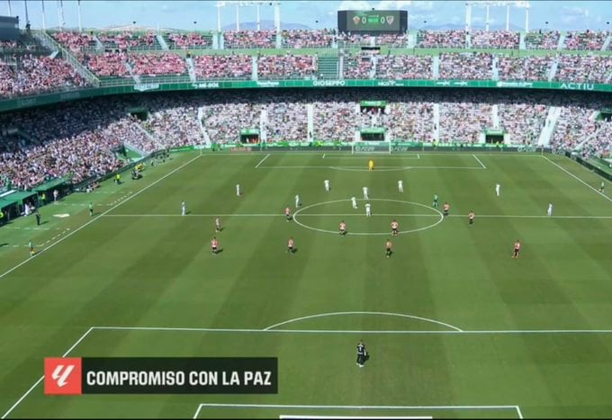 Durante el encuentro entre el Sevilla y el Mallorca, LaLiga ofreció un plano cenital (desde arriba) del círculo central, viéndose a los jugadores parados, pero también mostró un rótulo que decía "compromiso con la paz", queriendo confundir a los espectadores e insinuando que la protesta era como denuncia por los conflictos bélicos.