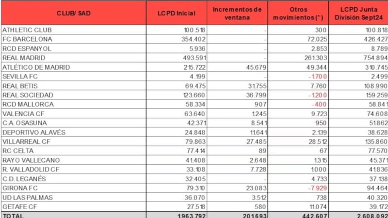 El club que más puede gastar es el Real Madrid, con un límite de 754 millones. Ha subido con respecto a lo tenía en el pasado mercado invernal (727). El Barcelona lo sigue de lejos con 426 millones. El tercero es el Atlético de Madrid con 310 millones.