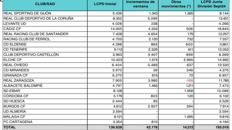 LaLiga ha dado a conocer este jueves los límites salariales de los 42 equipos que conforman el fútbol profesional en Primera y Segunda división. Es la cantidad que los conjuntos pueden destinar a gasto deportivo