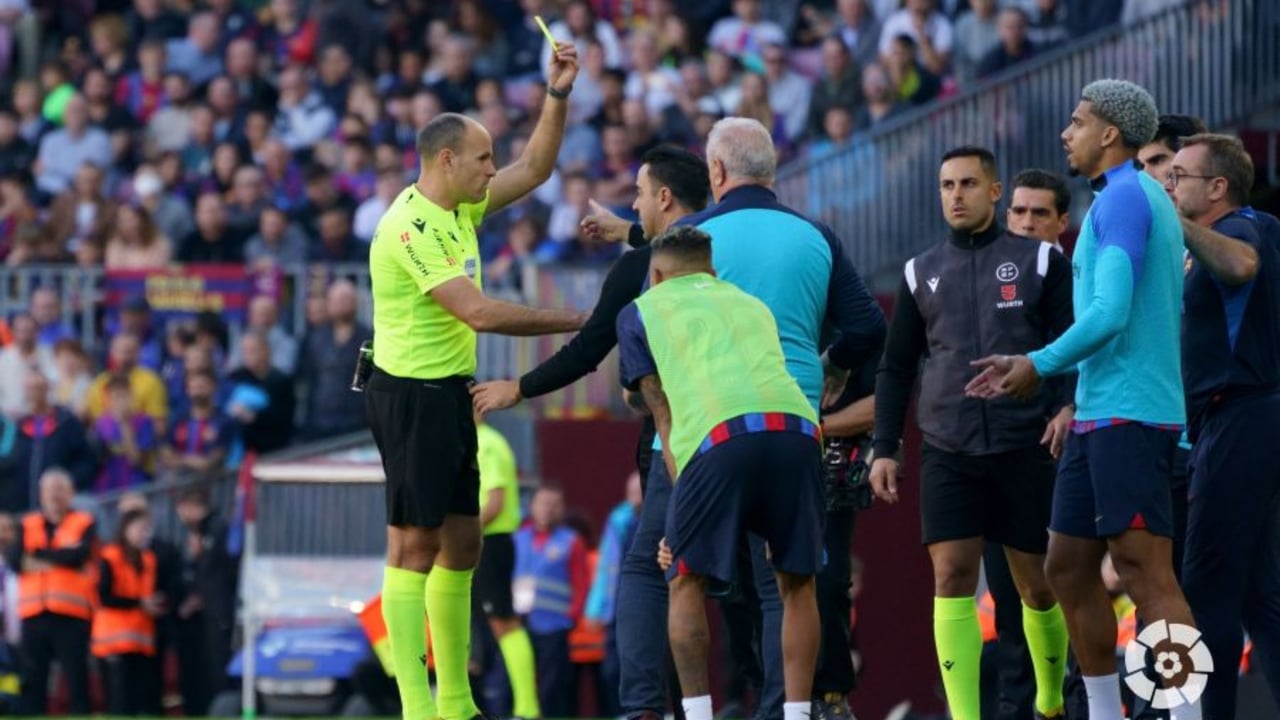 Mateu Lahoz enseñando una tarjeta al banquillo del BarçaLaLiga