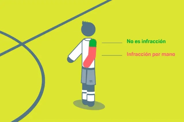 La señalización de una mano como falta ha evolucionado en los últimos años. En su última acepción, será mano cuando ésta "se posicione de manera antinatural y consiga que el cuerpo ocupe más espacio". En este sentido, "se considerará que un jugador ha conseguido que su cuerpo ocupe más espacio de manera antinatural cuando la posición de su mano o brazo no sea consecuencia del movimiento de su cuerpo en esa acción concreta o no se pueda justificar por dicho movimiento. Al colocar su mano o brazo en dicha posición, el jugador se arriesga a que el balón golpee esa parte de su cuerpo y esto suponga una infracción". Se considera mano punible cuando ocurra lo anteriormente descrito y el balón golpee desde la parte inferior de la axila hacia abajo.