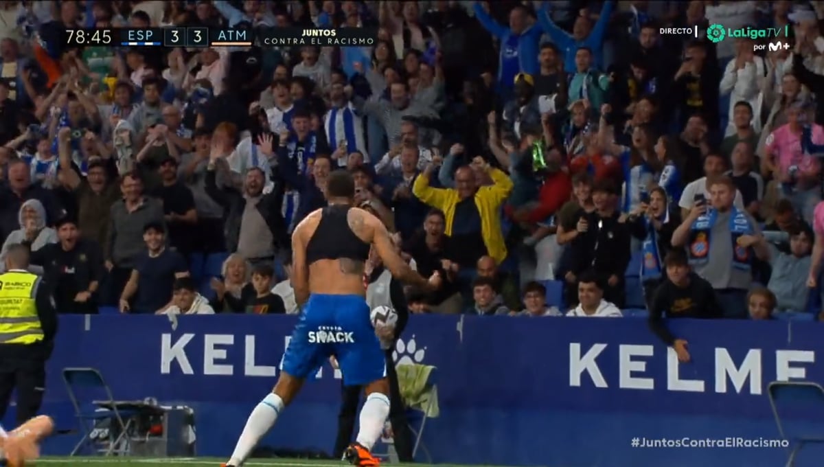 De un momento a otro el partido se enloqueció, el RCD Espanyol se negaba a darse por vencido y los cambios realizados por el técnico perico también surtieron su efecto. El primero de los locales llegó en el minuto 64, mediante un testarazo de César Montes tras un saque de esquina. Eso comenzó acelerar el ritmo del partido, las gradas comenzaron a animar y creer. Luego vino un 2-3 que no subió al marcador por fuera de juego. Pero la fe ya inundaba los corazones de los locales que también tiraban de cabeza. Comenzó a creer y a crecerse y Melamed, que estuvo muy bien durante todo el partido, pudo ser mucho más incisivo. Y el estadio que antes lanzaba reproches, en ese momento comenzó a animar. Y el Atlético quedó completamente encerrado en su campo bajo la presión del Espanyol durante muchos minutos. Como no podía ser de otra manera llegó el 2-3 gracias a Joselu en el 76, desde los once metros. Y a los dos minutos Vinícius, que salió desde el banquillo, hizo el 3-3.