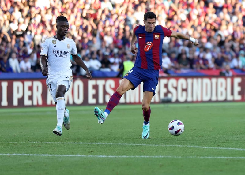 ¡¡Lewandowski!! Remató el polaco ante la presión de Tchouameni y su testarazo se fue arriba.
