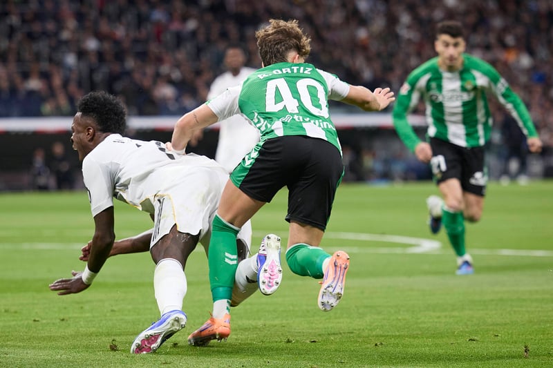 Respondió de inmediato el Betis con dos lanzamientos desde la larga distancia de Antony Deossa, pero quedó en un tímido paréntesis ante un Real Madrid que continuaba rompiendo con Vinicius ante un Ángel Ortiz ya con amarilla y con acumulación de hombres en posiciones adelantadas, con pasos al frente de Camavinga y Tchouaméni.