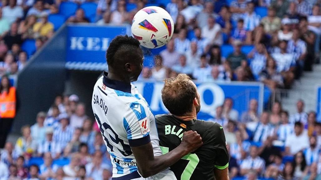 Sadiq cabecea en la disputa del balón con Blind.Twitter / @RealSociedad