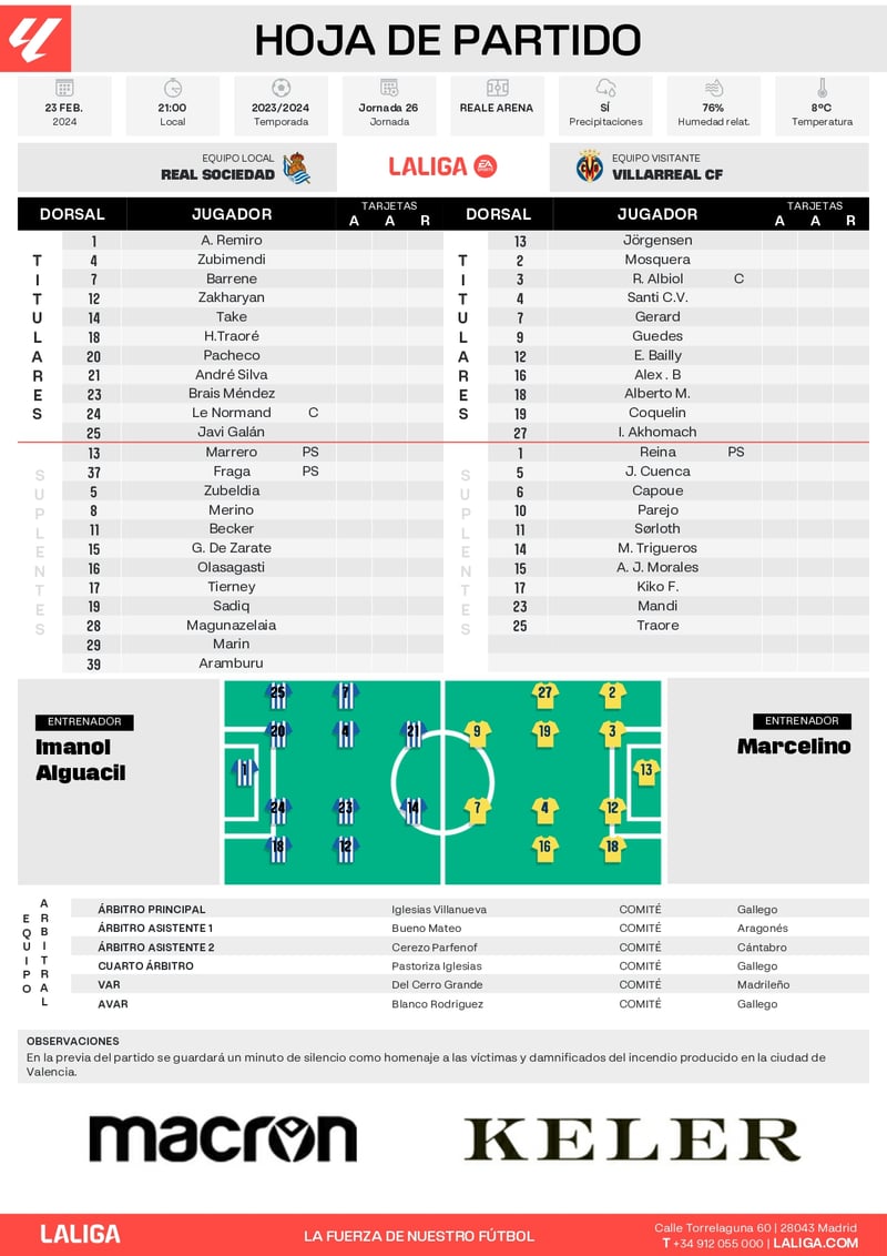El Villarreal afronta este choque con el objetivo de ampliar su racha de cinco partidos sin perder, pero también con la idea de dar un paso más y lograr una victoria que rompa la racha de empates que acumula, que son tres seguidos y cuatro en esos últimos cinco partidos. Por su parte, el conjunto dirigido por Imanol Alguacil quiere dar continuidad a la victoria cosechada en Son Moix, para lo que suma a la causa a los recuperados Kieran Tierney y Sheraldo Becker, quienes han vuelto a los entrenamientos con el resto de sus compañeros, y han entrado en la convocatoria.