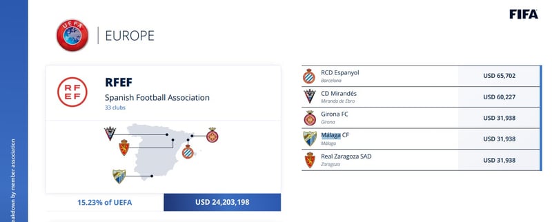- Málaga CF: el conjunto malagueño ha aparecido por sorpresa en la lista de equipos que han recibido ingresos por parte de la FIFA. Es de los clubes que menos ingresará, con un total de 31.938 dólares. No tuvo participantes en su plantilla, aunque algunos exmalaguistas como Ricardo Horta y Munir sí que acudieron a la cita.