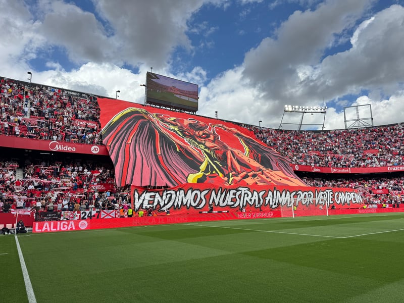 Suena el himno del Centenario sevillista a capela y se despliega un tifo en Gol Norte: "Vendimos nuestras almas por verte campeón".
