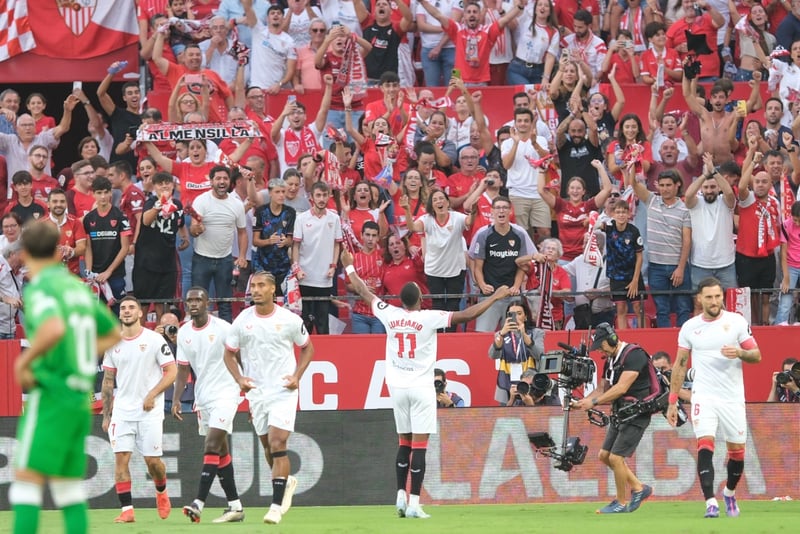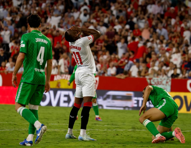 De inicio, la iniciativa correspondió al anfitrión, consciente de que tener el balón y, sobre todo, quitárselo al vecino podía ser crucial. Con Ejuke y Lukébakio como agitadores por fuera, pero también con Gudelj ayudando en la presión alta, los nervionenses pidieron penalti a los cuatro minutos por una mano dentro del área de Ricardo Rodríguez de ésas que ya no se pitan por venir rebotada de otra parte del cuerpo del defensor. Perseguía sombras en el arranque el conjunto de Pellegrini, lo que se materializó enseguida en un tanto anulado al nigeriano, eficaz para remachar en el segundo palo, aunque había fuera de juego en el inicio de la acción de Agoumé cuando recibía de Carmona. Con todo, tenían claramente una marcha más los blanquirrojos, una diferencia de intensidad que se plasmaba sobre el césped, por lo que tocaba achicar agua en verdiblanco.