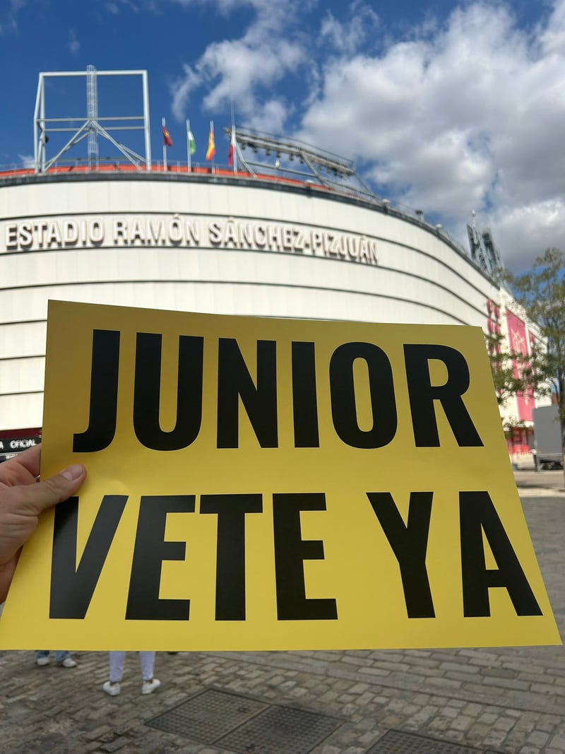Comienzan las protestas contra la directiva del Sevilla FC. "Directiva dimisión" y "Junior veta ya" son algunos de los cánticos que los aficionados del Sevilla FC está realizando en los alrededores del estadio Ramón Sánchez-Pizjuán. También se escuchan algunos insultos. El presidente se lleva la gran mayoría de críticas.