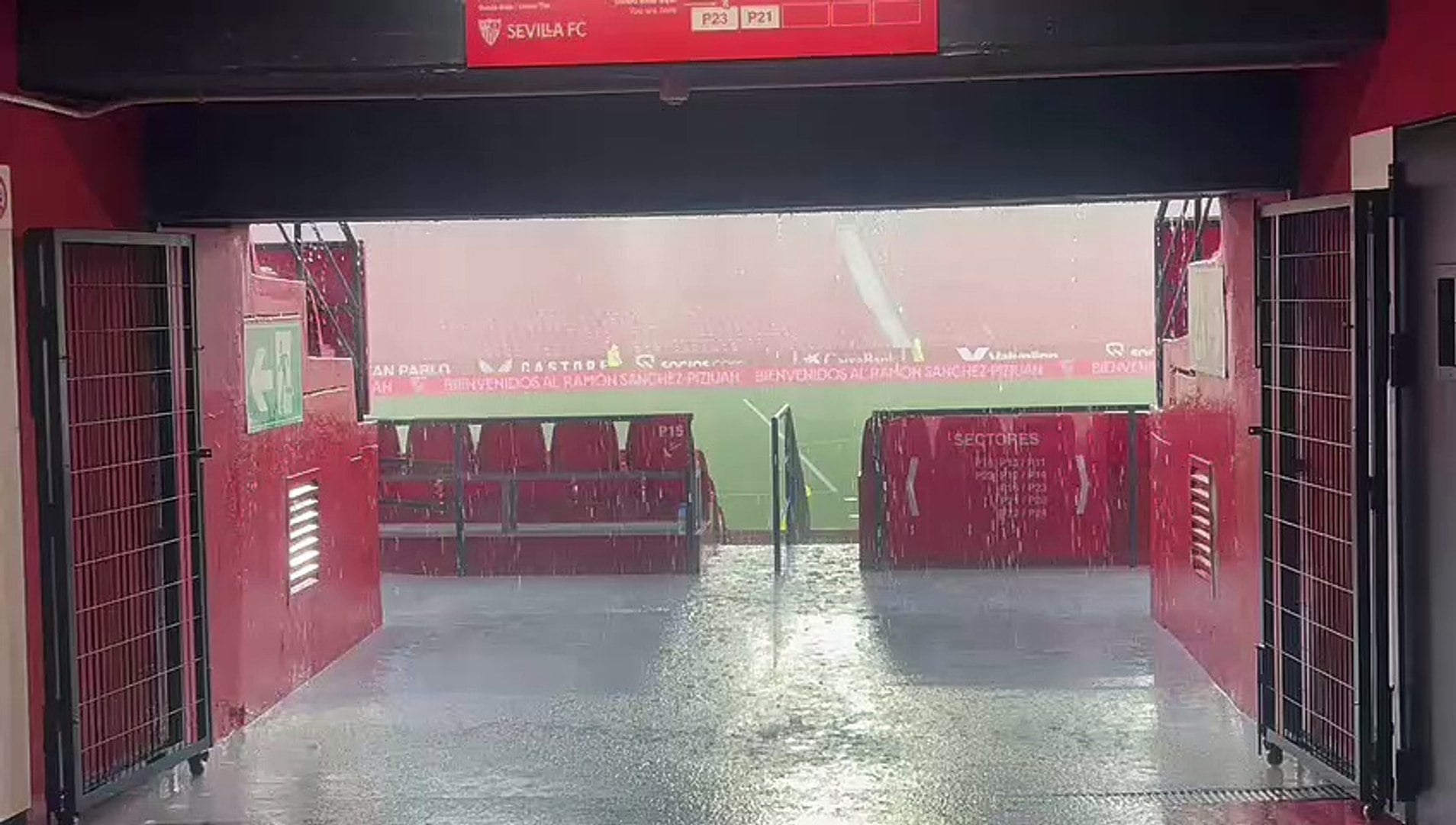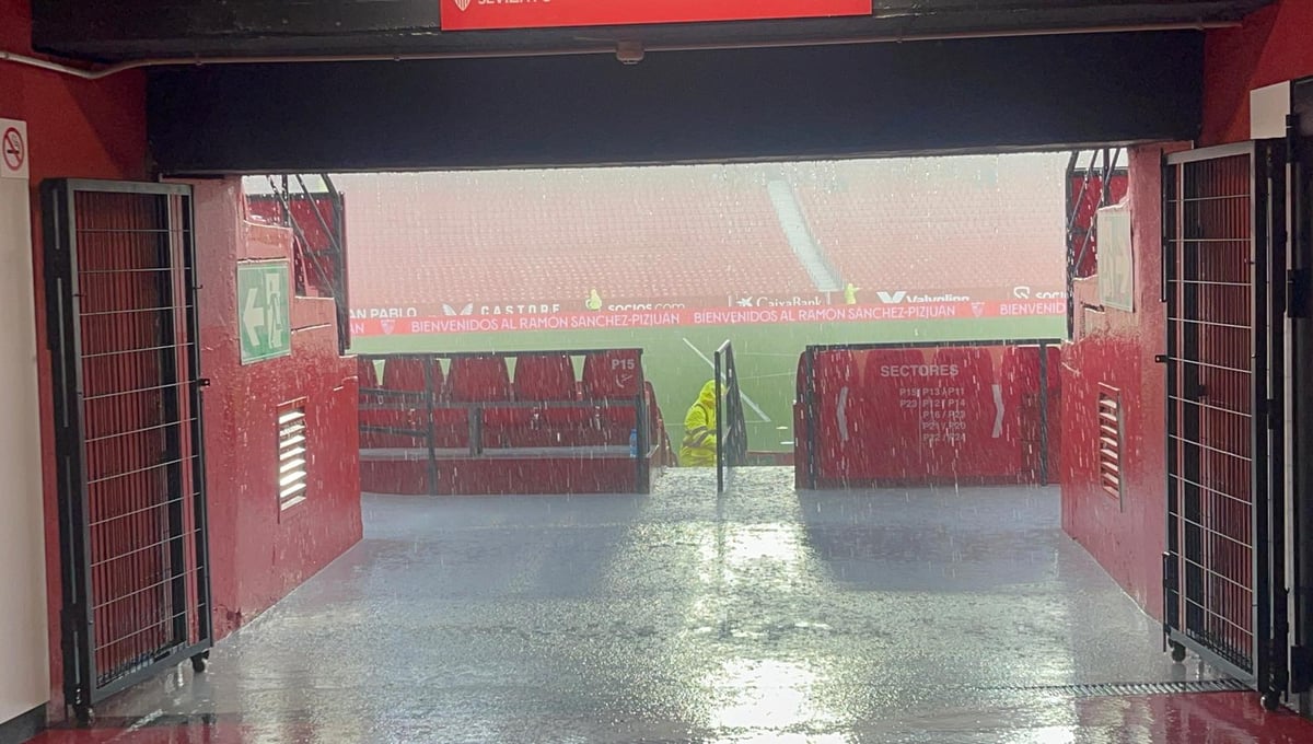 En estos momentos diluvia sobre el Sánchez-Pizjuán a menos de una hora para el inicio del choque. Acompaña a las precipitaciones una fuerte granizada, según documenta el compañero Alfredo de Anca (Lince Photo Agency).