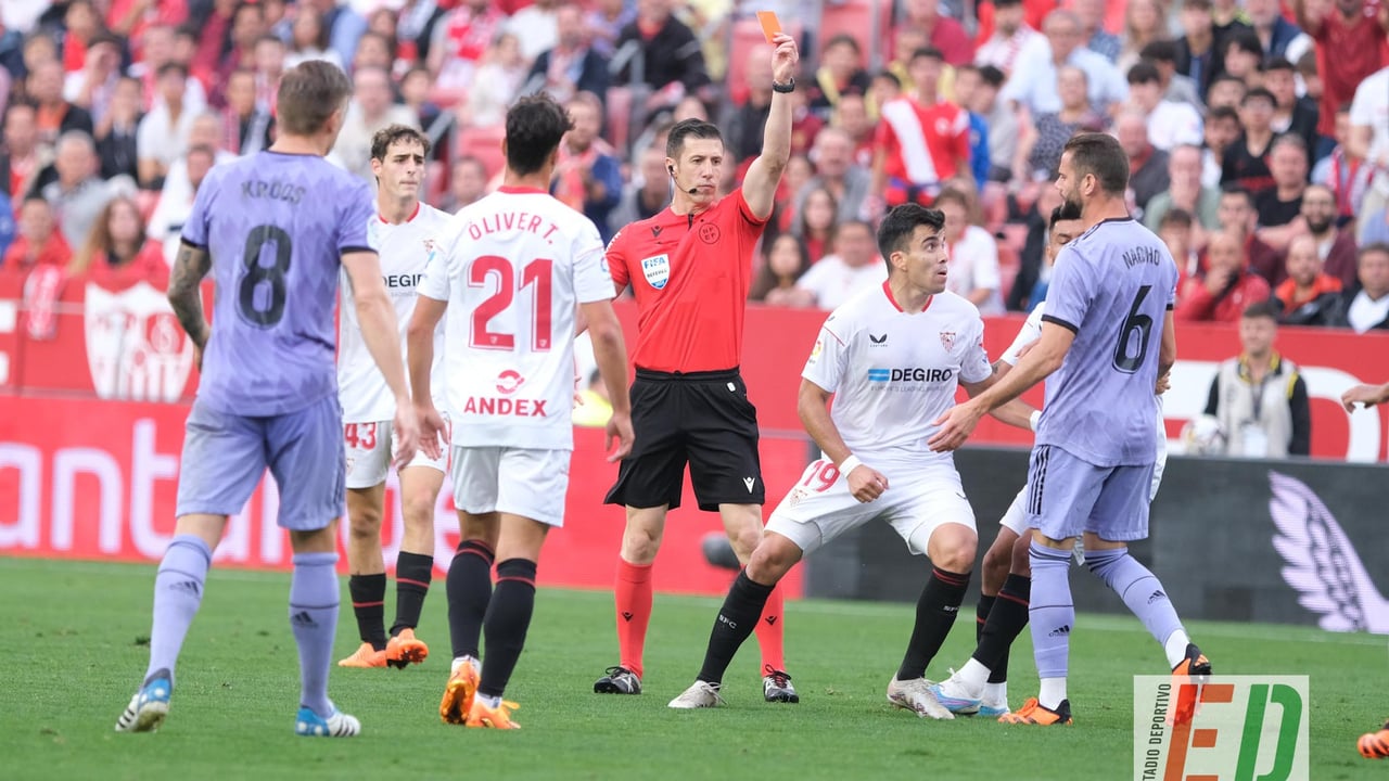 Árbitro: Soto Grado (riojano), con el aragonés Jaime Latre en el VAR. Roja directa al nervionense Acuña (84'). Amarillas a los locales Joan Jordán y Óliver Torres, así como a los visitantes Lucas Vázquez, Tchouaméni, Nacho y Dani Ceballos.