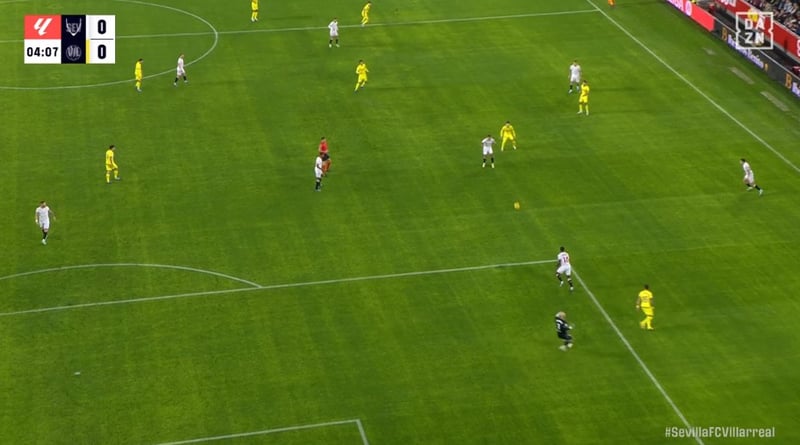 El Villarreal lo tiene claro, está impidiendo con pequeñas faltas cualquier salida de balón del Sevilla. Ahora ha sido Baena quien ha cometido falta sobre Nianzou.