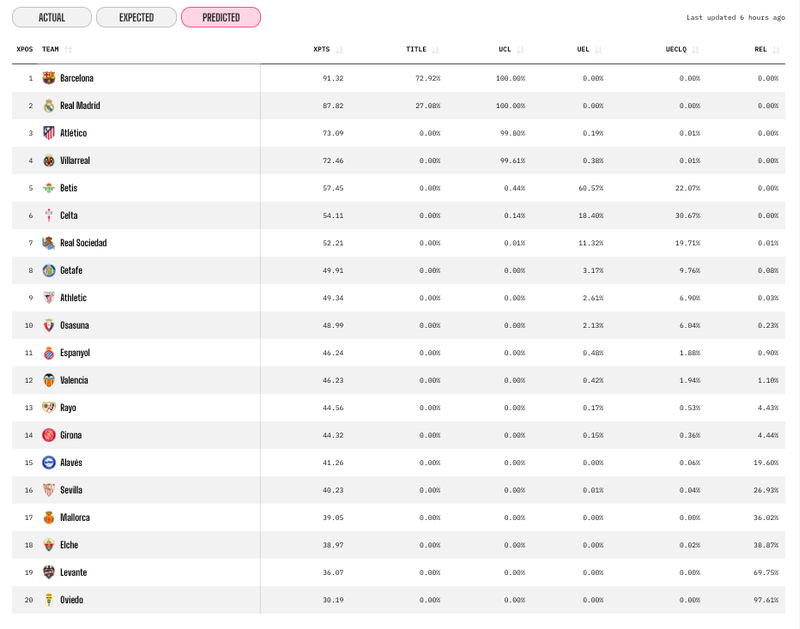 La supercomputadora de LaLiga marca el descenso en 39 puntos: Oviedo, Levante, Elche, Mallorca, Sevilla, Alavés y Rayo Vallecano