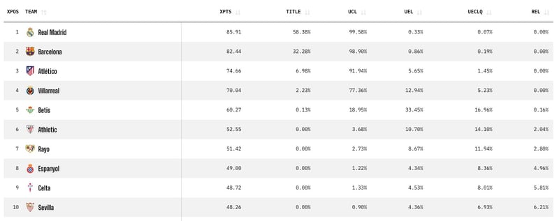 El Superordenador de Opta Analyst, empresa especializada en el análisis de datos y estadísticas que trabaja con IA, ha vuelto ha realizar un nuevo planteamiento del final de LaLiga en Primer división, con motivo de la llegada del nuevo parón.