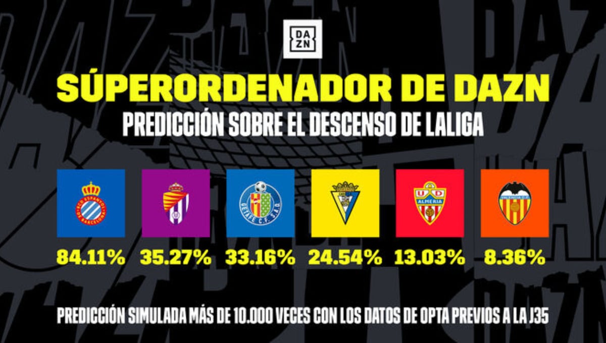 Se trata del superordenador de DAZN, que analiza el calendario de los seis equipos que se encuentran en la pelea por la permanencia a estas altura del campeonato. Según los datos de Opta, los dos equipos que descenderían de categoría serían el RCD Espanyol y el Real Valladolid.