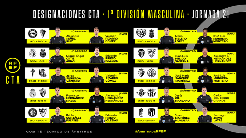 La Federación Española de Fútbol ya ha hecho oficiales las designaciones arbitrales para la jornada 21 de LaLiga EA Sports, que arranca este viernes y en la que los dos equipos hispalenses disputan sus partidos en la tarde-noche del domingo.