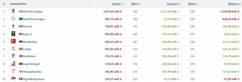 Según datos recogidos por Transfermarkt, la Premier League supera a todos en cuanto a gastos en fichajes. Le sigue Arabia Saudí, que ha gastado un tercio de lo que llevan hasta ahora los clubes ingleses, imagínense las diferencias. La Serie A italiana se coloca en tercera posición, le siguen la Ligue 1 y la Bundesliga; y en sexta posición está LaLiga EA Sports con algo más de lo que se ha gastado en Alemania. Da para comentar.